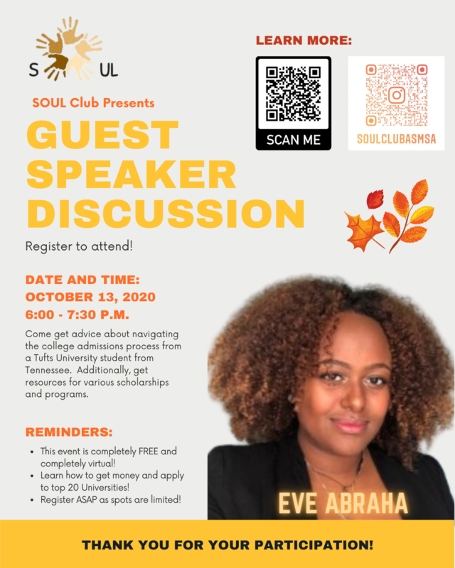 ASMSA and SOUL would be ecstatic if MSD secondary students would virtually attend this event. It would be a great opportunity for students to preoccupy themselves during the school year as well as allowing students to explore various career paths and networking opportunities they may be interested in. In this, it would be especially beneficial for students with questions or are looking for students in college.